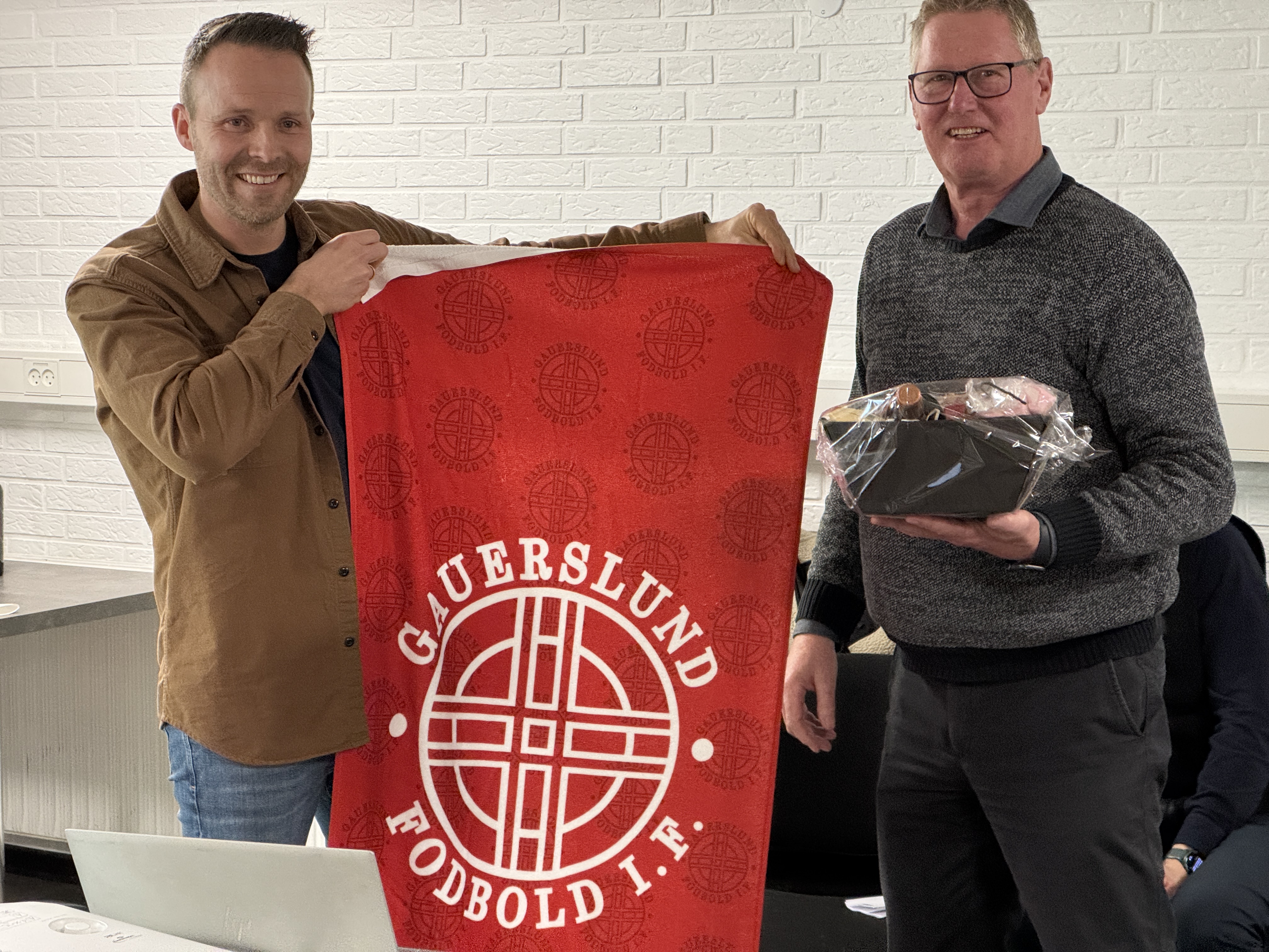 "Og får vi til en hjemmekamp arrangeret grill med mere, ja, så er det helt sikkert, at du stiller op hjælper til også bag disken. Dit input og engagement er også værdsat af Curling-holdet, som du gerne hjælper på vej. Og skulle man udenfor komme til at glemme tiden, ja, så hænger der nu uden på Hal 1 et ur, også det har du haft en finger med i spillet omkring. Men jeg tror faktisk ikke, at du bruger det ur til at minde dig selv om, hvor mange timers frivilligt arbejde, du lægger i Gauerslund IF Fodbold, sagde formanden".