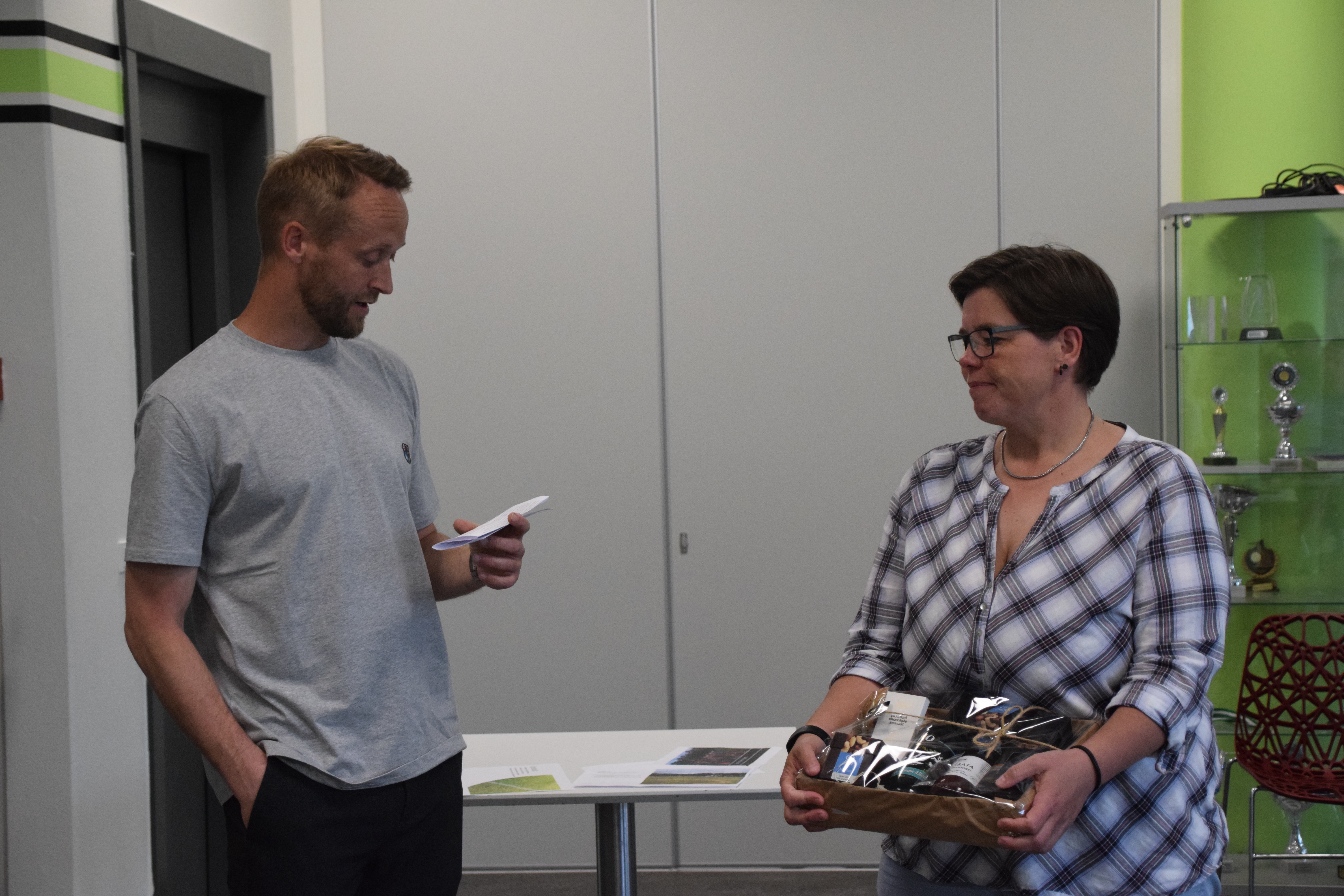 Formand for Sportsudvalget Henrik Jensen overrækker prisen til Årets Træner Sanne Andersen